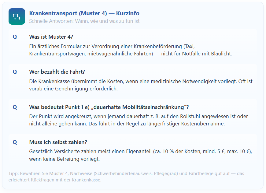Tipp: Bewahren Sie Muster 4, Nachweise (Schwerbehindertenausweis, Pflegegrad) und Fahrtbelege gut auf — das erleichtert Rückfragen mit der Krankenkasse.